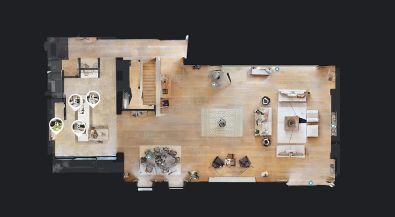 Matterport內(nèi)部近景模式,就像玩RPG遊戲一樣,只要點(diǎn)選地上的圓點(diǎn),就能在3D虛擬空間中自由移動(dòng),無論在哪裡都像身歷其境一樣;滑鼠只要點(diǎn)選Mattertags標(biāo)籤,就能看到想買的商品詳細(xì)的材質(zhì)、版型、尺寸。