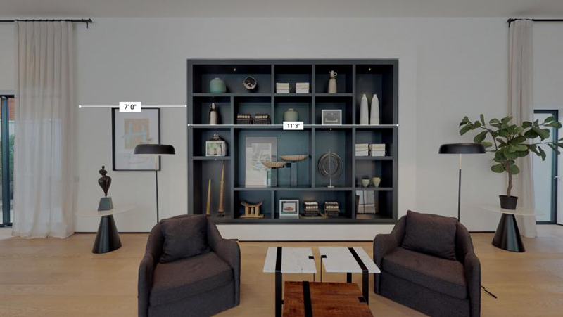 Matterport的測(cè)量尺寸模式,會(huì)自動(dòng)偵測(cè)室內(nèi)空間的牆壁、門、窗戶之間的距離,可以在3D虛擬空間中擬定你的室內(nèi)裝潢計(jì)畫。