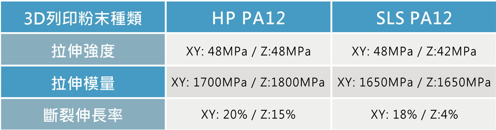 惠普HP的MJF目前僅提供PA材料,而重要的工程特性如:高耐衝擊、變形…等特性尚未完全成熟發(fā)展,隨著科技日新月異,相信未來會有更多材料選擇。