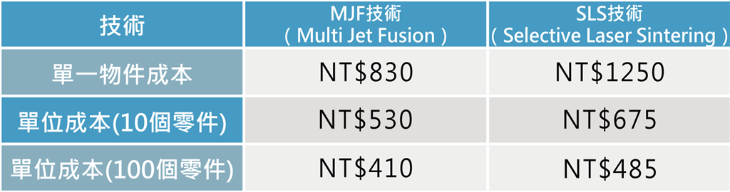 下表可以看到,由於MJF專屬的後處理及冷卻簡化流程,單一物件的3D列印價格較SLS更低,然而隨著數(shù)量增加,兩種技術(shù)的價格相當趨近,因為一次性列印多個SLS零件會降低平均成本。
