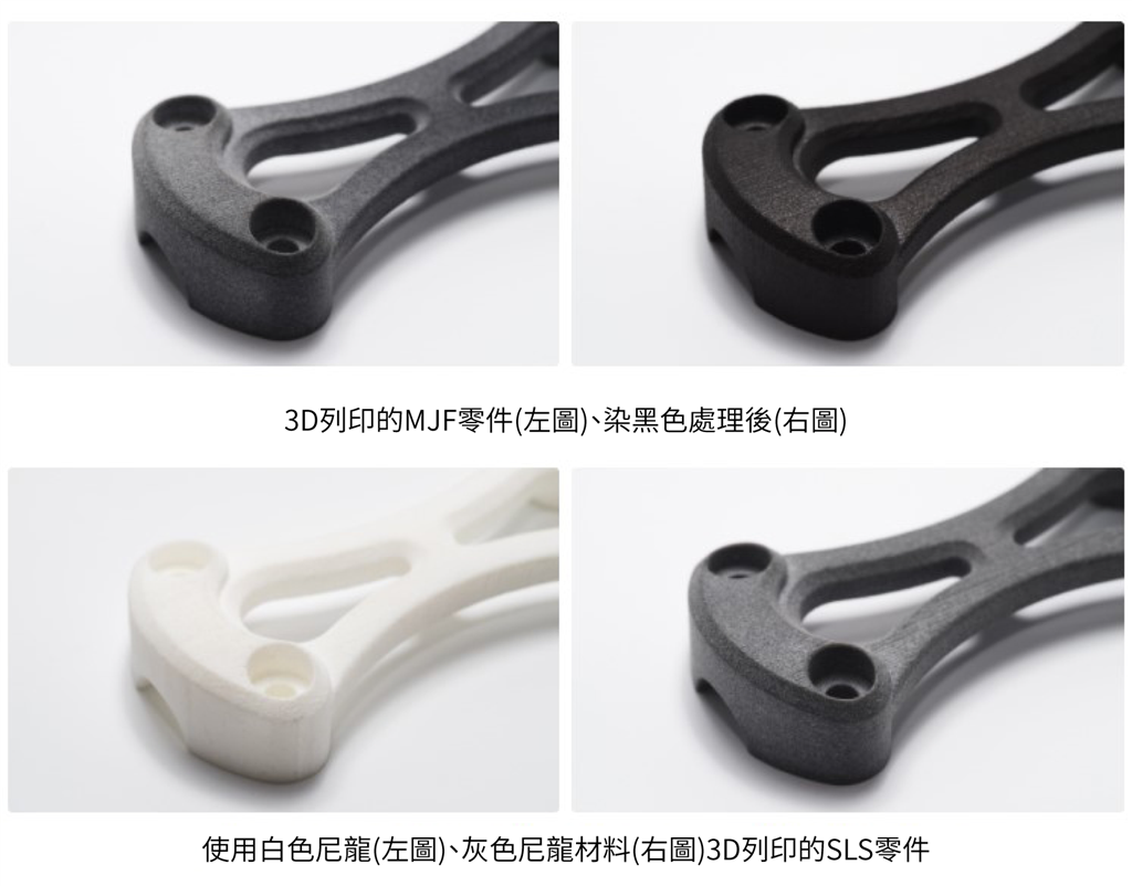 這兩種3D列印成品都呈現(xiàn)霧面質(zhì)感,其中MJF通常為黑色,因為深色溶劑可以更有效吸收熱源;SLS零件則常為白色、較容易染色處理,灰色的SLS尼龍粉末也十分常見,這類材料觸感較MJF更平滑。