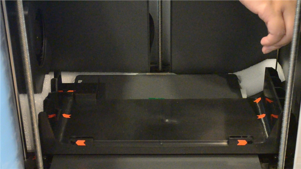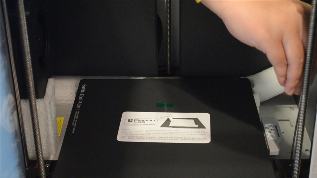 打開玻璃門,下方有紅色箭頭,兩個(gè)螺絲需要先轉(zhuǎn)開。AMS就可以從上方取出。撕下列印頭的保護(hù)紙板,取出線材清洗槽的泡棉。