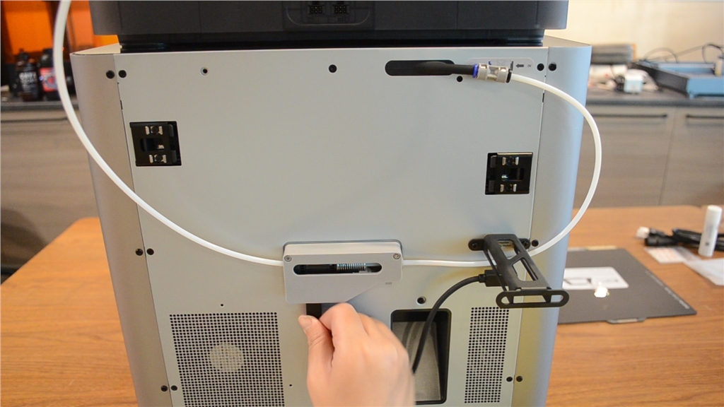 撥開白色部分的線材進(jìn)口卡榫,將線材插入一定長(zhǎng)度即可,AMS會(huì)自動(dòng)偵測(cè)線材材質(zhì)。