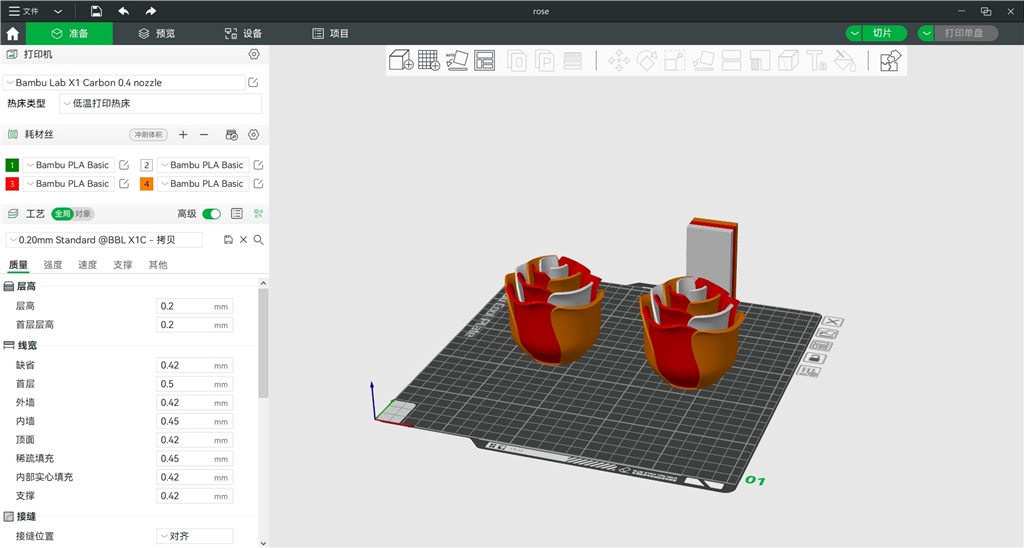 首先將玫瑰花的STL檔案放入Bambu Studio裡,由於不需要任何支撐,不太會(huì)操作軟體也能印喔!Bambu Lab X1 Carbon Combo一次可以四色列印,可以挑自己喜歡的顏色去印,創(chuàng)造屬於個(gè)人特色的玫瑰花喔!