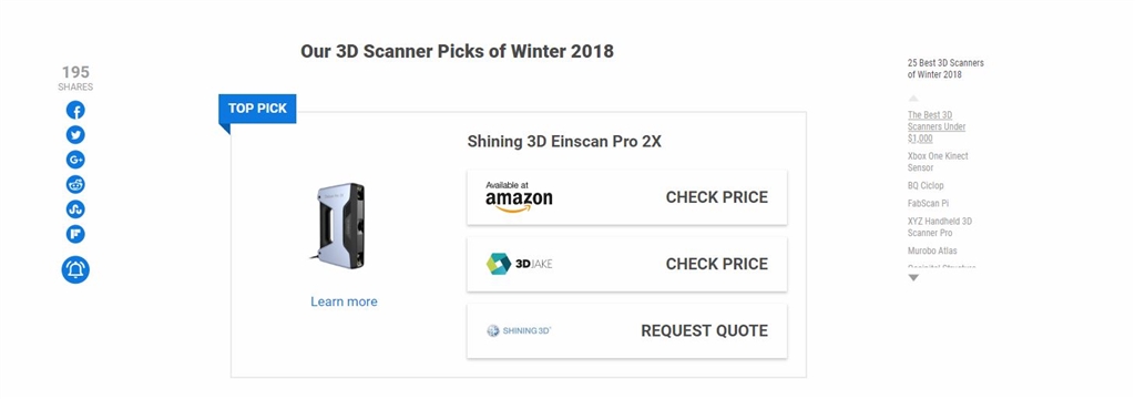 【3D掃描工程】All3DP全球最佳3D掃描器首選:EinScan Pro 2X All3DP是世界領(lǐng)先的3D列印雜誌,內(nèi)容引人入勝且無論對於初學(xué)者或熟練的老手都有幫助;除了3D列印相關(guān)的教育和娛樂訊息外,更經(jīng)常發(fā)佈具有公信力的全球3D列印產(chǎn)品評比。 EinScan Pro 2X也在剛結(jié)束的2018年冬季獲選為25種全球最佳3D掃描器指南的首選(比較內(nèi)容包含性價比),在Ultimaker S5獲選為All3DP的2018秋季最佳雙噴頭3D列印機(jī)之後;再度證實(shí)了三帝瑪為顧客挑選3D列印產(chǎn)品的品質(zhì)。 (圖片來源:All3DP網(wǎng)站2018冬季25款全球最佳3D掃描器評比) 現(xiàn)在就帶各位看這款最佳3D掃描器的使用方式及詳細(xì)功能有哪些: .EinScan Pro系列技術(shù) EinScan Pro系列採用白光3D掃描技術(shù)來達(dá)成高精度和高速度,這種專業(yè)級系統(tǒng)可以利用良好的顏色紋理捕捉小至0. 03mm大至4米的物體;EinScan Pro 2X為該系列最新的手持式3D掃描器,更適用於中、小型物體,能在不犧牲精度的前提下完成高速3D掃描。 .四種3D掃描模式 EinScan Pro 2X提供手持式快速掃描、手持式高精度掃描和固定掃描模式(再分為搭配轉(zhuǎn)盤與否)。以搭配自動轉(zhuǎn)盤的做法使用EinScan Pro 2X進(jìn)行手持式快速掃描,能快速捕捉雕像的立體3D圖檔,還可直接透過3D列印製造出另一個實(shí)體。 .兩種手持掃描模式 手持掃描分為快速或高精度模式,在快速掃描模式下,EinScan Pro 2X每秒可處理高達(dá)1,500,000點(diǎn)(30 fps)的速度;相比之下高精度掃描較慢,但能提供更無可挑剔的掃描精度,最高可達(dá)0.05毫米。 這兩種手持模式都可以透過在掃描物體上貼定位貼紙來提高準(zhǔn)確度,讓最小點(diǎn)距離縮小為0.2mm,進(jìn)而運(yùn)算出高分辨率的3D數(shù)位成像。 .新系列升級版 同時發(fā)布的EinScan Pro 2X Plus是升級版,主要為提高掃描速度和準(zhǔn)確性,具有更高的單次掃描範(fàn)圍、點(diǎn)距離和掃描距離。雖然兩個3D掃描器的掃描精度和景深相同,但相較於基本的2X型號更適用於研究、設(shè)計藝術(shù)和文化遺產(chǎn)、工程和醫(yī)療保健等應(yīng)用。 前一版的EinScan Pro系列當(dāng)然也是非常好的選擇,也依然列在這25種最佳3D掃描器的名單裡,只是新出的Pro 2X更加超越舊版的名次。 EinScan-Pro +也是多功能的3D掃描器,可以捕捉大、小物體,總體而論,適合多用途的3D掃描情況,EinScan Pro 2X系列則更適合專業(yè)級的使用。 不愧是評選最佳的3D掃描器是不是很強(qiáng)大呢?如果各位有看過我們之前使用EinScan Pro Plus完成的掃描文章(延伸閱讀:逆向工程實(shí)測,怪獸與牠們的模型!),可以發(fā)現(xiàn)它的精度非常細(xì)緻完整,而新一代的EinScan Pro 2X系列功能又更加強(qiáng)大。另外我們除了提供掃描服務(wù),而近期我們也會發(fā)佈相關(guān)實(shí)測,歡迎持續(xù)關(guān)注三帝瑪?shù)牡谝皇窒ⅲ?br /> 追蹤粉絲專頁、抓住3D技術(shù):https://www.facebook.com/m.jcybusiness.com/