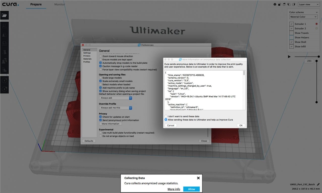 Ultimaker Cura 3.4有什麼新功能? ●3D CAD軟體的新集成外掛,如AutoDesk Inventor 2018,Blender,F(xiàn)reeCAD和OpenSCAD ●新的設(shè)定備份外掛,可將您的設(shè)定保存在雲(yún)端。在不同地點(diǎn)的多個(gè)平臺(tái)上使用您的首選設(shè)置,或?qū)⒛脑O(shè)定展示給多個(gè)用戶 ●更流暢的搜尋自定義模式下的設(shè)定 繼續(xù)閱讀來了解更多功能亮點(diǎn): 外掛更新 工具箱。 外掛瀏覽器已重新設(shè)計(jì)到工具箱中,並附帶圖形元素以提供關(guān)於可用外掛的更多資訊。 Cura備份。 在安裝時(shí),Ultimaker Cura中的設(shè)定,材料和外掛可以備份到雲(yún)端。 在我們的加密安全服務(wù)器上建立一個(gè)帳戶,使用您的Ultimaker Community登錄帳戶,並隨時(shí)隨地將您的配置設(shè)定儲(chǔ)存在世界的任何地方。 將您的設(shè)定備份到雲(yún)端並可以隨時(shí)進(jìn)入。 將您的首選設(shè)定展示給辦公室,工作臺(tái),工作室或教室中的多個(gè)用戶。 AutoDesk Inventor集成。 將AutoDesk Inventor的檔案(零件,裝配,草圖)直接在Ultimaker Cura中開啟。 Blender集成。 直接將Blender檔案在Ultimaker Cura中開啟。 OpenSCAD集成。 將OpenSCAD檔案直接在Ultimaker Cura中開啟。 FreeCAD集成。 將FreeCAD檔案直接在Ultimaker Cura中開啟。 OctoPrint外掛。 Ultimaker Cura的OctoPrint外掛新版本。 切片引擎升級(jí) 填充支撐。 啟用後,僅在需要時(shí)才會(huì)生成填充,並使用專門的支撐生成算法來生成零件的內(nèi)部支撐結(jié)構(gòu)。 優(yōu)化填充材料的使用,縮短了列印時(shí)間。 只在需要支撐的區(qū)域生成填充,縮短列印時(shí)間 打孔前先列印外圍周長。減少列印噴嘴移動(dòng)時(shí)從列印平臺(tái)上移除孔周長的風(fēng)險(xiǎn),方法是優(yōu)先考慮外部。如果在內(nèi)壁之前列印外層,此設(shè)定應(yīng)該只有效果。 控制回抽。新選項(xiàng)能更好的控制回抽: 最大梳理距離,無回抽。設(shè)定為非零值時(shí),梳理行程比該距離長的行程將使用回抽,以保持最佳的噴嘴壓力以獲得更好的列印品質(zhì)。 最大梳理解析度。梳理過程保持至少1.5mm長,以防止緩衝區(qū)欠載,獲得更好的列印品質(zhì)。 運(yùn)作時(shí)避開支撐。增加設(shè)定執(zhí)行移動(dòng)時(shí)要避開的支撐??梢宰畲笙薅鹊販p少列印噴嘴撞上列支撐材料的風(fēng)險(xiǎn),提高列印可靠性。 支撐牆線數(shù)量。增加可設(shè)定配置列印支撐的牆壁數(shù)量。 UFP修改器網(wǎng)格。修改器網(wǎng)格會(huì)顯示在Ultimaker S5螢?zāi)缓虲ura Connect隊(duì)列中顯示的UFP圖像預(yù)覽中。這已被修復(fù),因此可忽略它。 交叉填充圖像。導(dǎo)入可控制交叉填充和交叉填充密度的圖像。請(qǐng)注意,可能需要調(diào)整填充密度的百分比才能被看見。 UX介面增強(qiáng) 匿名數(shù)據(jù)共享。 「發(fā)送匿名數(shù)據(jù)」彈出式禁用按鈕已改為「更多訊息」的按鈕,具有啟用或禁用的匿名數(shù)據(jù)並查看共享的特定數(shù)據(jù)選項(xiàng)。 設(shè)定過濾器超時(shí)。為了獲得更好的性能,設(shè)定過濾器現(xiàn)在會(huì)在輸入時(shí)被觸發(fā),或在500ms超時(shí)後被觸發(fā)。 導(dǎo)入後自動(dòng)選擇模型。設(shè)定選擇新導(dǎo)入模型行為的新偏好設(shè)定。 事件測(cè)量。在特定事件期間增加日誌記錄,包括啟動(dòng)時(shí)間、檔案載入持續(xù)時(shí)間,切片時(shí)列印平臺(tái)上的項(xiàng)目數(shù)量,切片持續(xù)時(shí)間以及在列印平臺(tái)上移動(dòng)項(xiàng)目時(shí)的性能。這些數(shù)據(jù)可以用來測(cè)試不同機(jī)器的性能。 設(shè)定錯(cuò)誤幫手??赡艿呐渲脵n案錯(cuò)誤,如材料或品質(zhì)設(shè)定檔案中不正確的檔案和重複檔案,會(huì)自動(dòng)檢測(cè)並在彈出視窗中進(jìn)行告知。儲(chǔ)存訊息是為了防止將來發(fā)生相同的錯(cuò)誤。 可升級(jí)捆綁資源。現(xiàn)在可以安裝多個(gè)版本的捆綁資源:捆綁版本和下載升級(jí)。如果軟體升級(jí),則不會(huì)載入捆綁版本。如果它不存在,Ultimaker Cura將恢復(fù)到捆綁版本。 第三方列印機(jī)和穩(wěn)定修復(fù)程序 已對(duì)Felix Tec4列印機(jī),Deltacomb和Rigid3D Mucit增加新的列印機(jī)定義。 Ultimaker Cura 3.4包含大量針對(duì)高品質(zhì)用戶體驗(yàn)的錯(cuò)誤修復(fù): 空白檔案名稱。如果一個(gè)空白檔案名稱被發(fā)送到Cura Connect,Ultimaker Cura會(huì)告知為已發(fā)送,但不會(huì)出現(xiàn)在Cura Connect的隊(duì)列中。現(xiàn)在檢測(cè)到空白檔案名稱並會(huì)設(shè)定為“未命名”以防止發(fā)生這種情況。 列印作業(yè)名稱重新切片。修復(fù)了列印作業(yè)名稱在重新切片時(shí)改回原始名稱的行為。 命名Curaproject。修復(fù)了在儲(chǔ)存項(xiàng)目時(shí)與檔案中兩個(gè)“curaprojects”相關(guān)的錯(cuò)誤。 Ultimaker S5在高處時(shí)暫停。修正了Ultimaker S5 Z馬達(dá)停止供電的錯(cuò)誤,使用高度腳本中的暫停時(shí)造成底板因重力而降低。 訊息框樣式。修復(fù)與消息框樣式相關(guān)的錯(cuò)誤,例如「發(fā)送數(shù)據(jù)」彈出框中的按鈕與進(jìn)度條重疊。 線材直徑線寬。調(diào)整線材直徑以計(jì)算GCODE分析器中的線寬。 韓語翻譯。修正韓文翻譯中的錯(cuò)誤。 ARM / Mali系統(tǒng)。修復(fù)了ARM / Mali系統(tǒng)