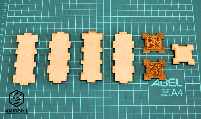 FLUX beambox在小尺寸2cm的印章上,雕刻出高解析度的效果、清楚呈現(xiàn)筆畫(huà)寬度只有1mm的毛筆字體,雷射切割拼圖結(jié)構(gòu)只需要1分鐘、雕刻印章也只花5分鐘就完工。