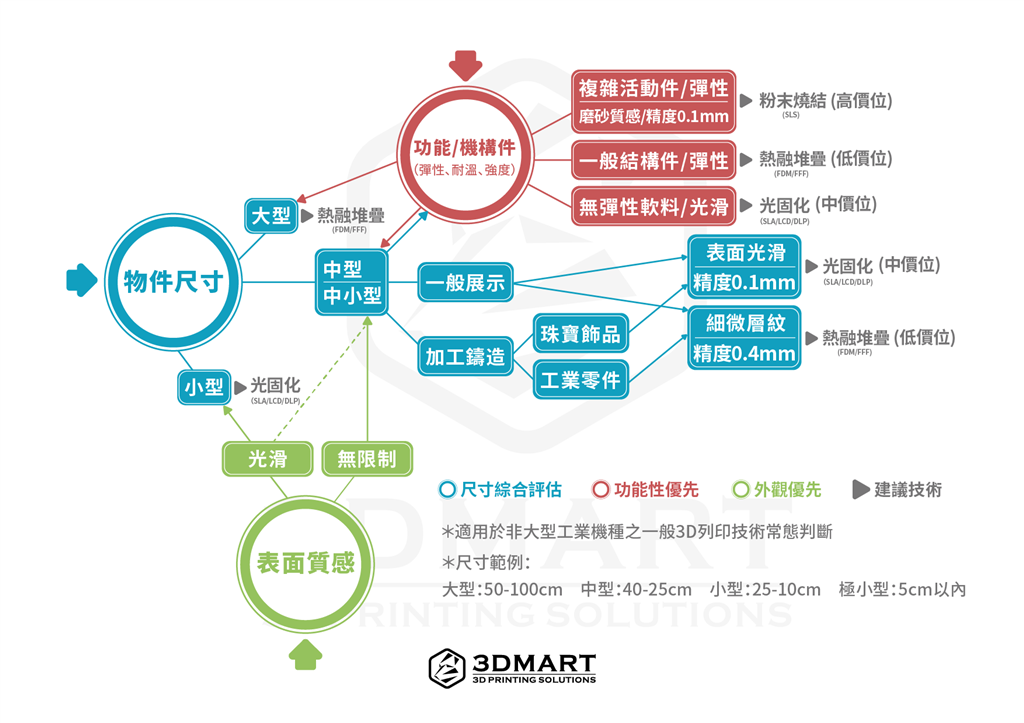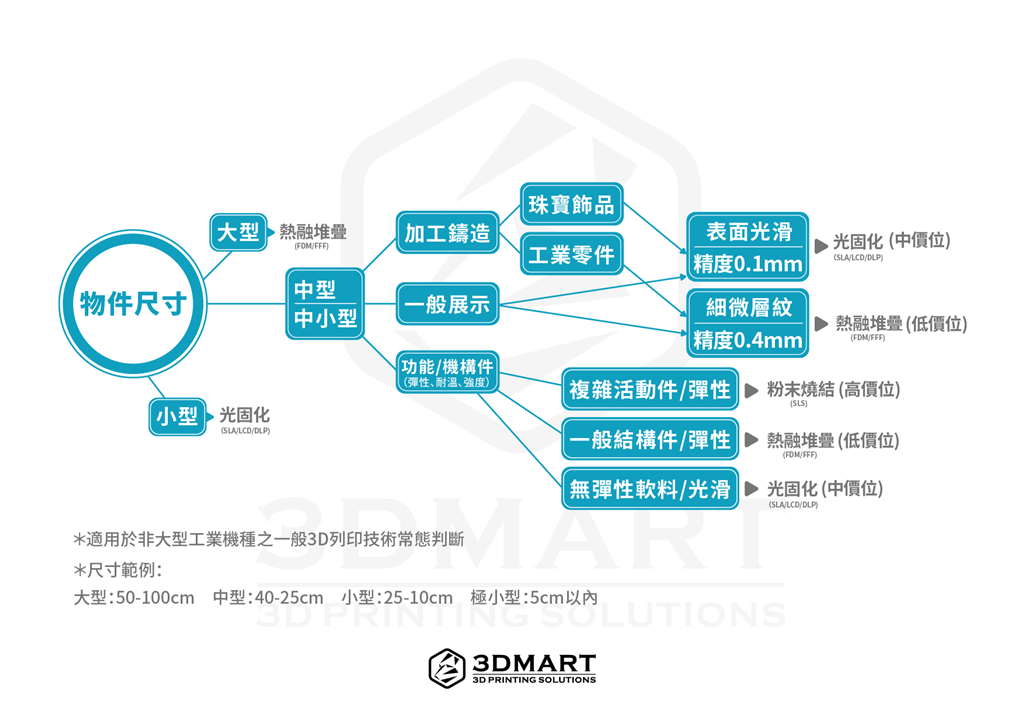 即使完全不了解3D列印技術的差別,只要知道大約有哪些選擇,並掌握自家物件的用途或外觀要求,就能大致判斷需要的方向,幫助快速選擇合適的應用類別。以市面最常見的3D列印技術來說,可分為熱融堆疊(FFF/FDM)、光固化(SLA/LCD/DLP)、粉末燒結(SLS):