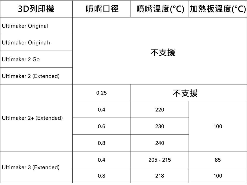 表列中的溫度適用噴嘴口徑和列印材料是很重要的。此外,請(qǐng)確認(rèn)在Ultimaker 3D印表機(jī)上選擇正確的材料設(shè)定,使印表機(jī)能夠自動(dòng)地調(diào)整到相對(duì)應(yīng)的溫度。