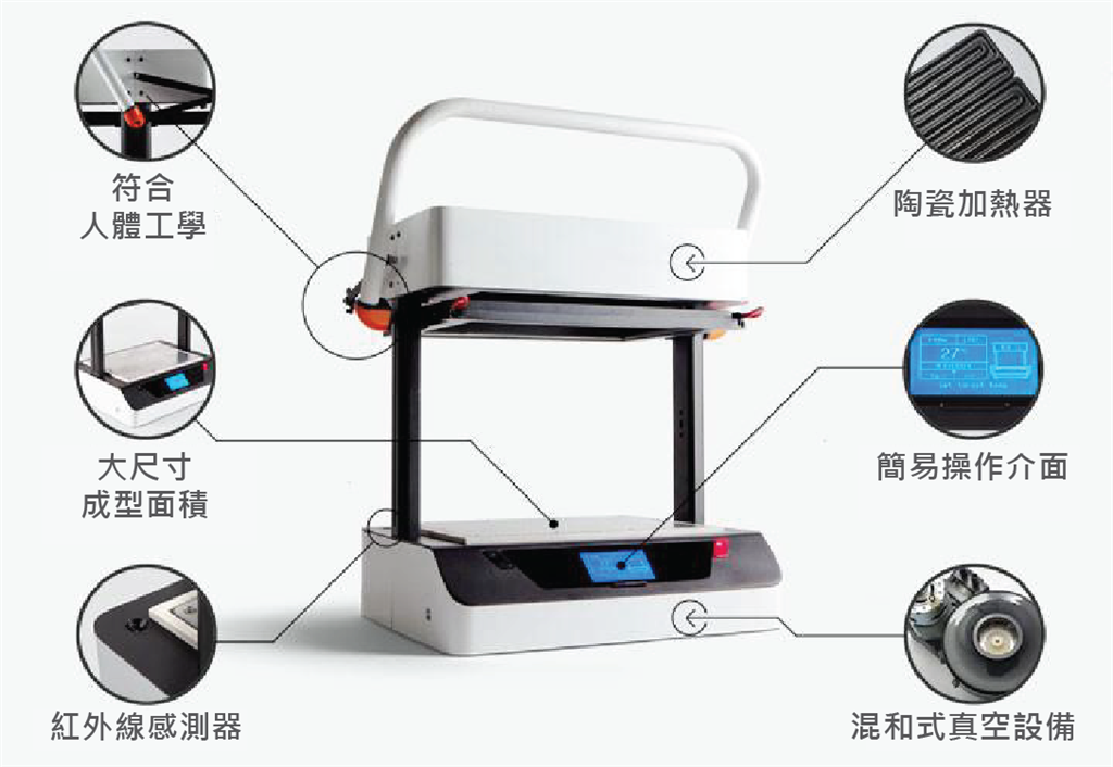 使用3D列印機列印產(chǎn)品原型後,再利用真空成型機進行殼模複製,能快速符合各種小型量產(chǎn)、開發(fā)產(chǎn)品、生產(chǎn)包裝等中小企業(yè)的運作形式。並且它的價格相對平實、體積精簡,也適合一般工作室、學校、創(chuàng)客空間自由使用。