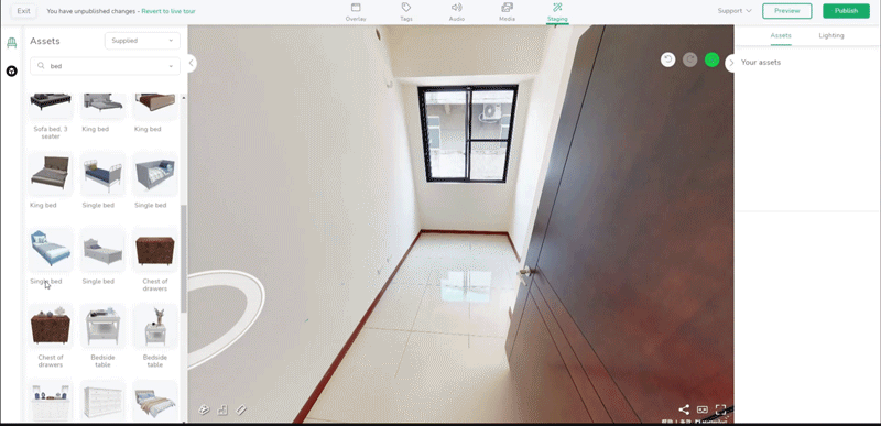 從左邊欄位的Assets挑選合適的家具,放置想要的位置即可,還可以針對(duì)家具的大小與旋轉(zhuǎn)進(jìn)行調(diào)整,是不是超方便!