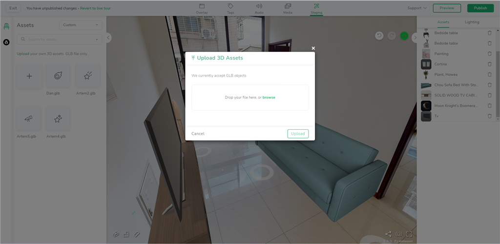 如果還是沒(méi)有找到滿意的素材,captur3d支援glb格式檔案,在Custom可以上傳。