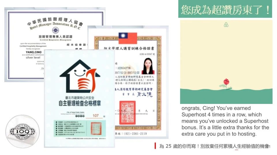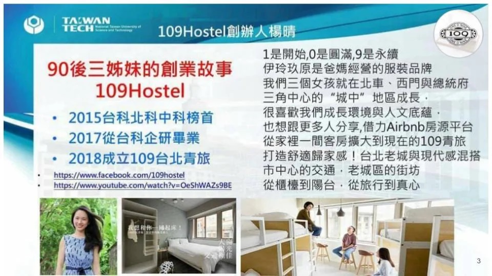 臺科念碩士時,林孟諺教授在臺上講著airbnb共享經(jīng)濟(jì),因此我們真的從家裡一間客房開始,到現(xiàn)在取得旅館證到連鎖,一開始的初衷初心,1是開始,0是圓圓滿滿,9是長長久久,109原是爸媽經(jīng)營的服飾品牌,我們?nèi)齻€女孩就在北車、西門與總統(tǒng)府,三角中心的”城中”地區(qū)成長,很喜歡我們成長環(huán)境與人文底蘊(yùn),也想跟更多人分享,借力Airbnb房源平臺,從家裡一間客房擴(kuò)大到現(xiàn)在的109青旅,打造舒適歸家感,臺北老城與現(xiàn)代感混搭,市中心的交通,老城區(qū)的街坊,從櫃檯到陽臺,從旅行到真心。