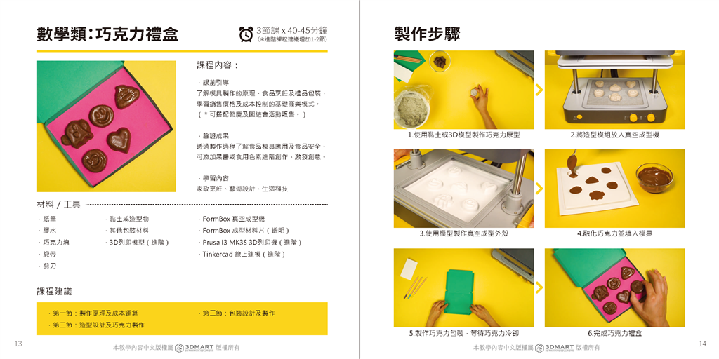 家裡一大堆巧克力吃不完嗎?使用3D模型重新製作巧克力原型,再將融化的巧克力填入真空成型模具中,簡(jiǎn)單幾個(gè)步驟就能設(shè)計(jì)自己的巧克力,口味也能依照需求更換;過程中可以學(xué)習(xí)食品模具應(yīng)用,進(jìn)而激發(fā)創(chuàng)意!