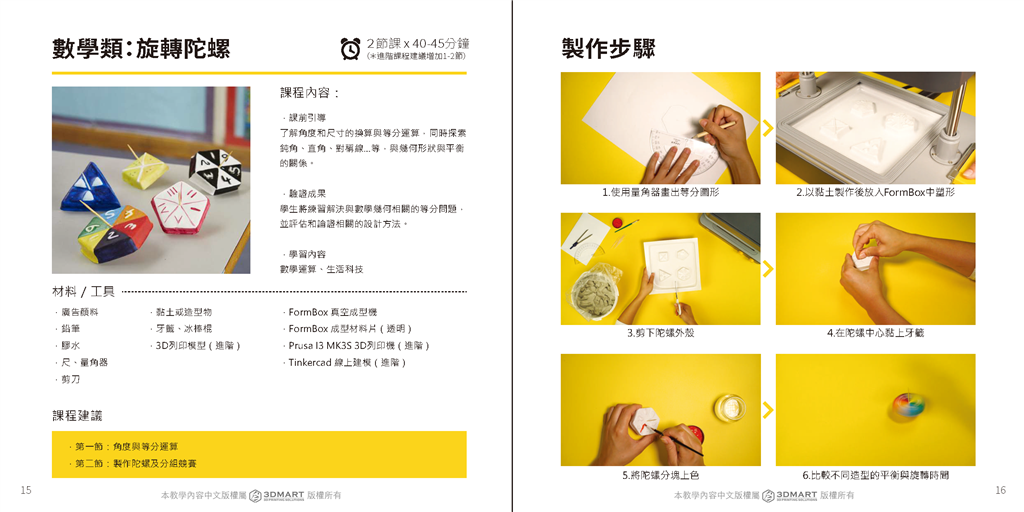 自製戰(zhàn)鬥陀螺!透過量角器畫出等分的圖形,以黏土進(jìn)行真空成型後,剪下外殼、黏上牙籤後,將陀螺依照喜好上色;藉此能了解角度和尺寸的等分運(yùn)算,在學(xué)習(xí)數(shù)學(xué)的同時(shí)搭配設(shè)計(jì)樂趣,讓學(xué)習(xí)之路更有趣深刻。
