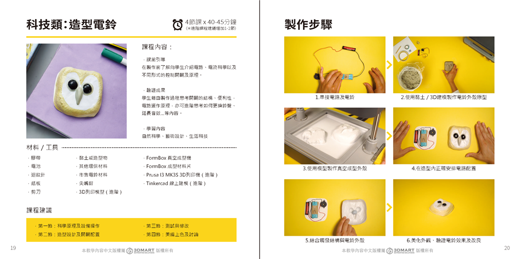 使用黏土或3D模型搭配真空成型製作電鈴的外殼,放入串接電路和電鈴後結(jié)合電鈴造型,除了可以了解電路、電流科學(xué),也能進(jìn)階學(xué)習(xí)如何更換電鈴聲,製作獨(dú)一無二的電鈴。