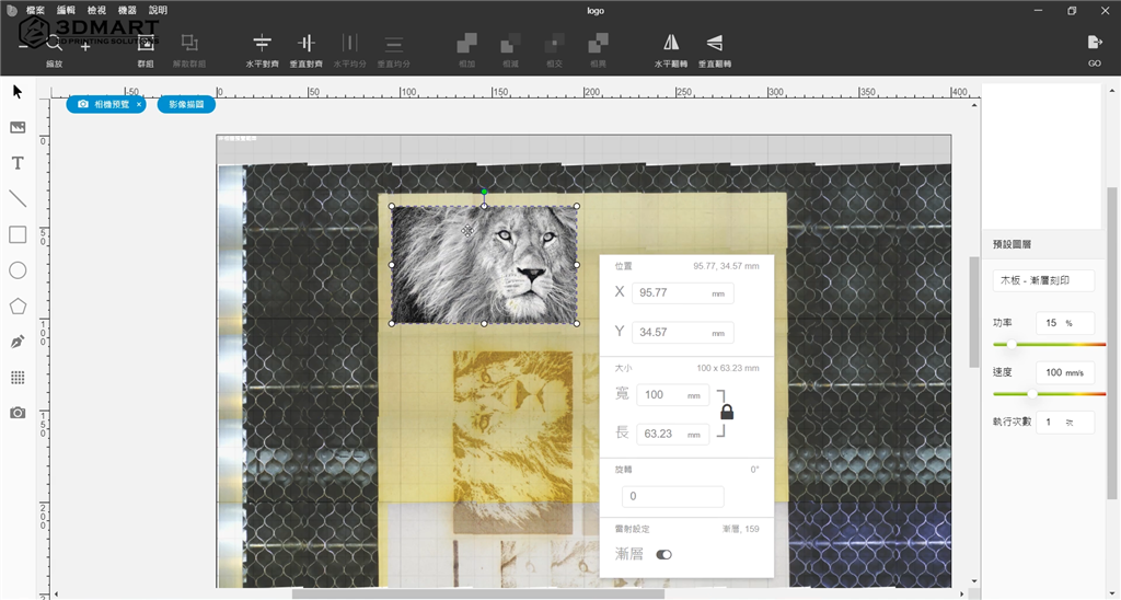 在MUSE專用的軟體RetinaEngrave中,除了能編輯圖片尺寸、位置,也可以針對(duì)解析度、功率、速度、模糊程度進(jìn)階調(diào)整。