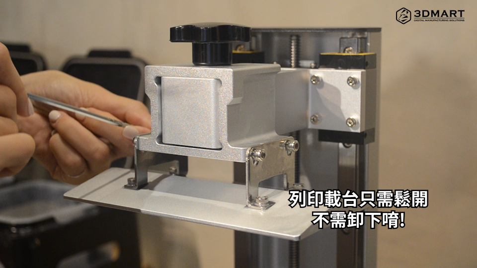 將樹(shù)脂槽卸下,並將列印載臺(tái)左右固定螺絲鬆開(kāi)(載臺(tái)不需卸下)