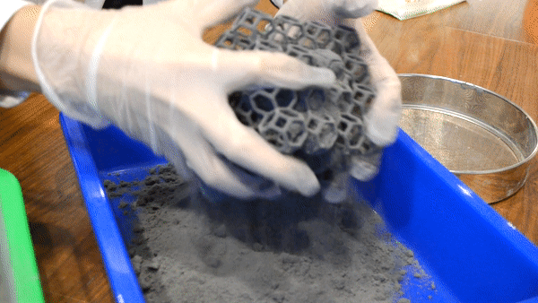 右邊的列印平臺無須填入粉末,會在機器封閉進行3D列印時會透過左邊的進粉槽逐層覆蓋;填充完成後,只要按照Sinterit Lisa的指示步驟開始列印就會自動完成囉!完成並開啟後,3D列印粉末及成品都會跑到右邊的列印平臺,平臺會將列印完成的粉末塊推升,用專用刮勺整塊剷起即可。
