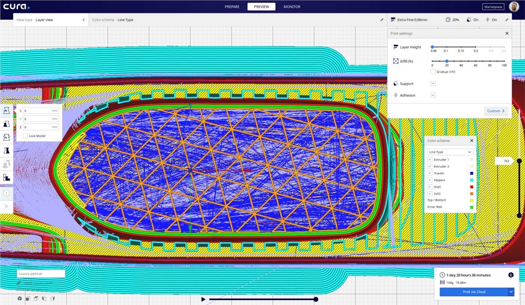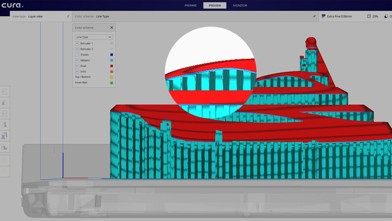 預(yù)覽視圖中的填充和支撐界面現(xiàn)在有新的配色選擇,可以更容易在複雜的模型中區(qū)分它們。填充線現(xiàn)在顯示為橘色,支撐界面則以藍色做出區(qū)別;這項功能在上方的「顏色方案」>「線條類型」中可以找到。