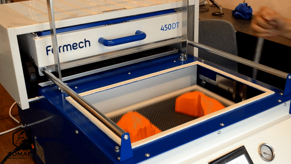 一切準備就緒後,將手柄往前下壓,工作平臺就會往上移動貼近材料片,這時候只要按下吸塑按鍵就能快速、不費力的完成真空成型;Formech 450DT的自動脫模功能,機器會自動將材料片吹離模具,直接一鍵脫模!