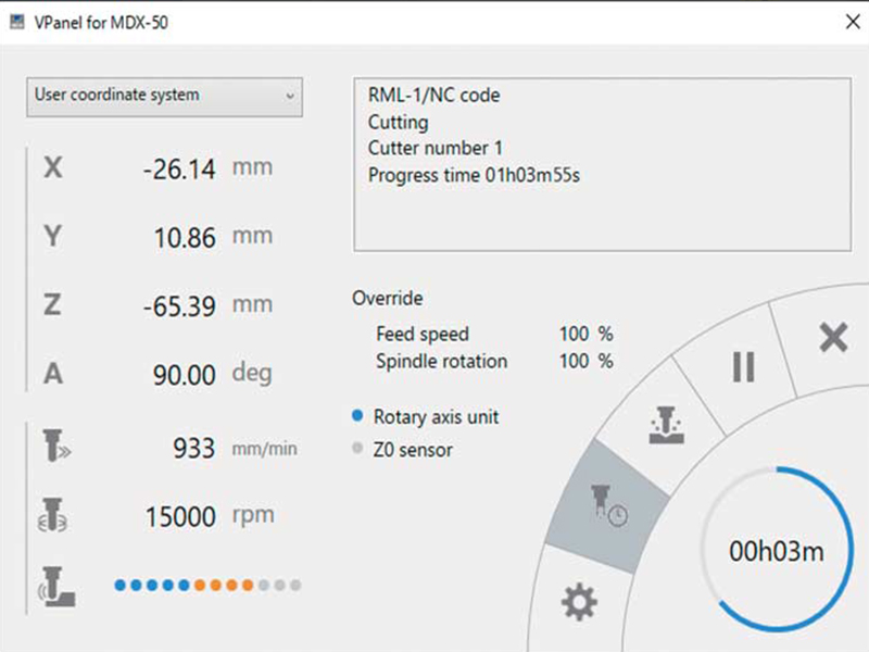Become a 3D milling expert almost immediately with the MDX-50's simple yet powerful built-in control panel and virtual control panel (VPanel), and bundled SRP Player CAM software that's easy-to-use and simplifies operation. With the control panel at the front of the unit, almost all operations can be completed from the unit itself without having to go back to a PC. The VPanel interface operates seamlessly with the MDX-50 and allows users to make changes to spindle rotation or speed during operation.