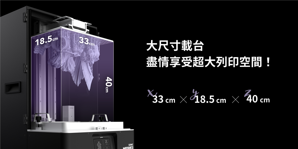 Sonic Mega 8K V2 擁有超大尺寸載臺(tái) 33 x 18.5 公分與超高40公分Z軸,一次完成超大尺寸或多分件模型,無需分次列印。