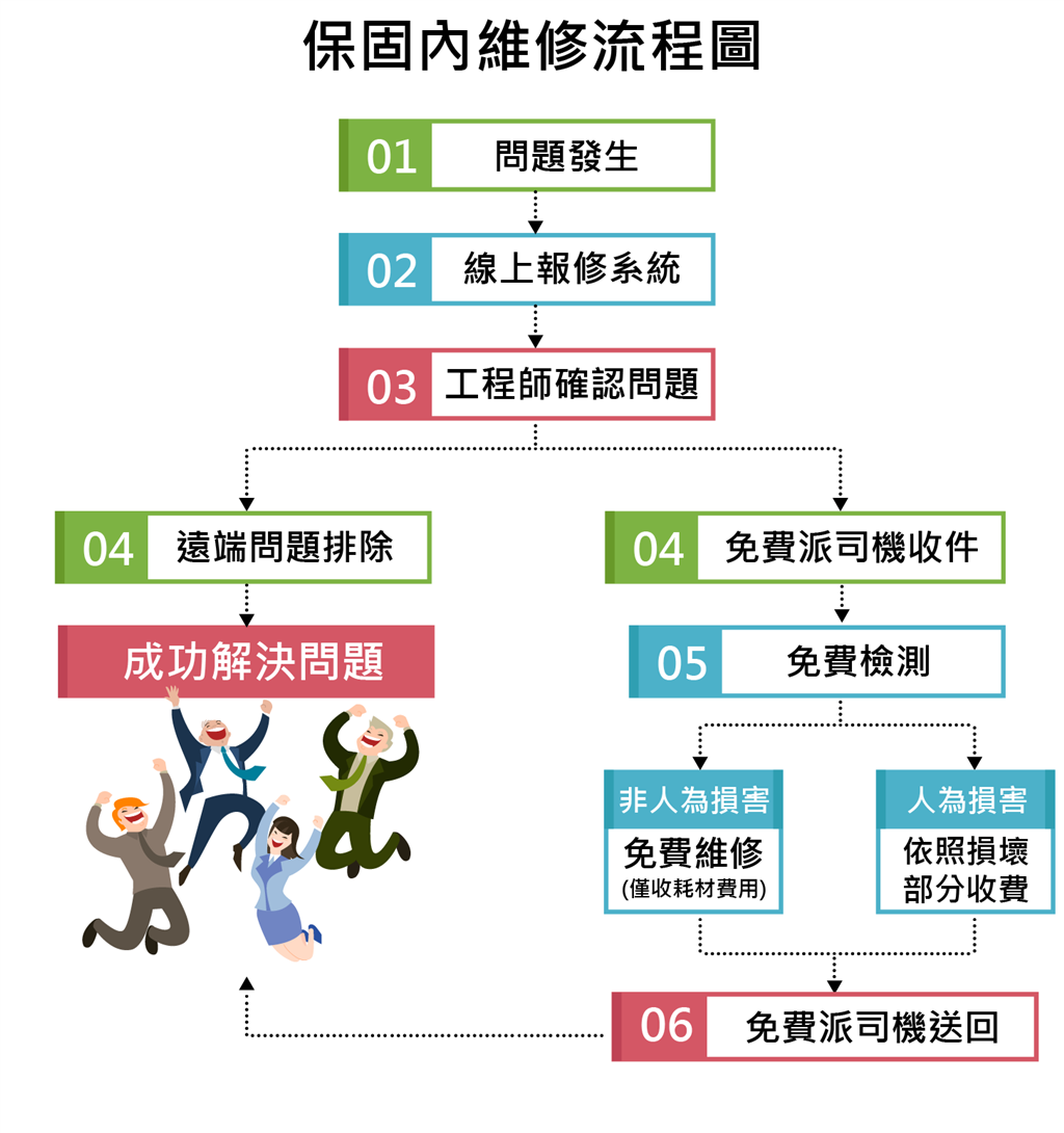 商品在保固期間內(nèi)皆已包含免費(fèi)收送及免費(fèi)檢修等服務(wù);若需額外到府檢測(cè),每次將酌收工程師出勤費(fèi)5000元起。由於維修設(shè)備及零件皆位於臺(tái)北總部,到府服務(wù)僅提供機(jī)器檢測(cè),臺(tái)灣本島以外、零件更換及其他費(fèi)用另計(jì),並依照工程師現(xiàn)場(chǎng)判斷為主。