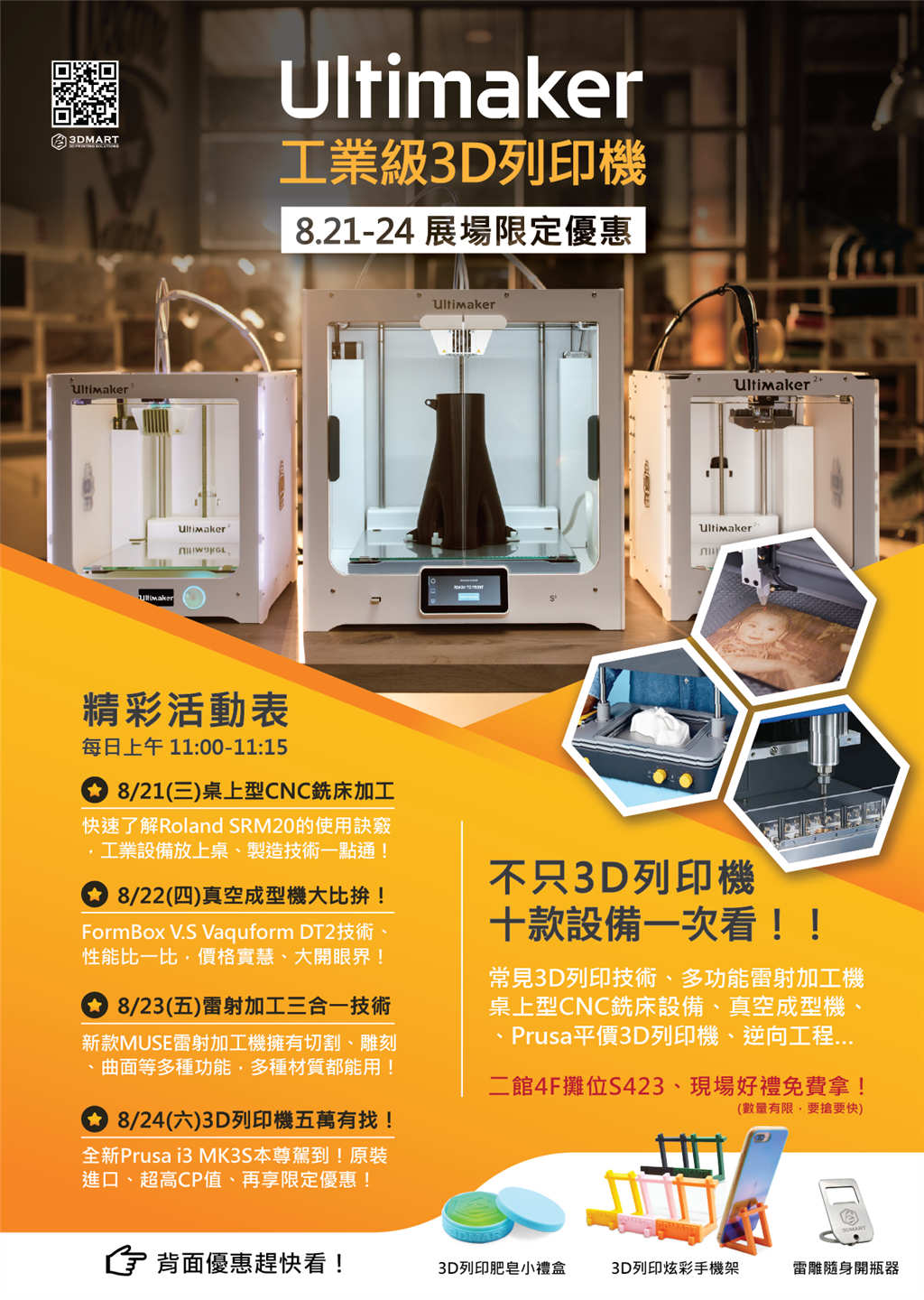 最後,最重要的就是免費(fèi)好禮啦!快來攤位上找我們玩、索取贈品及限定優(yōu)惠,每天早上11:00還有精彩的新機(jī)展演活動,豐富內(nèi)容等你來看!