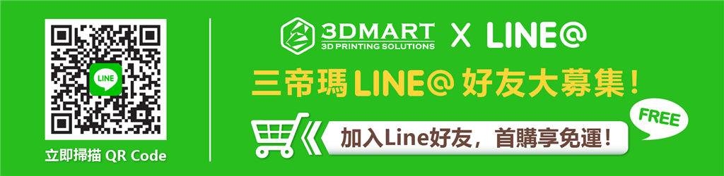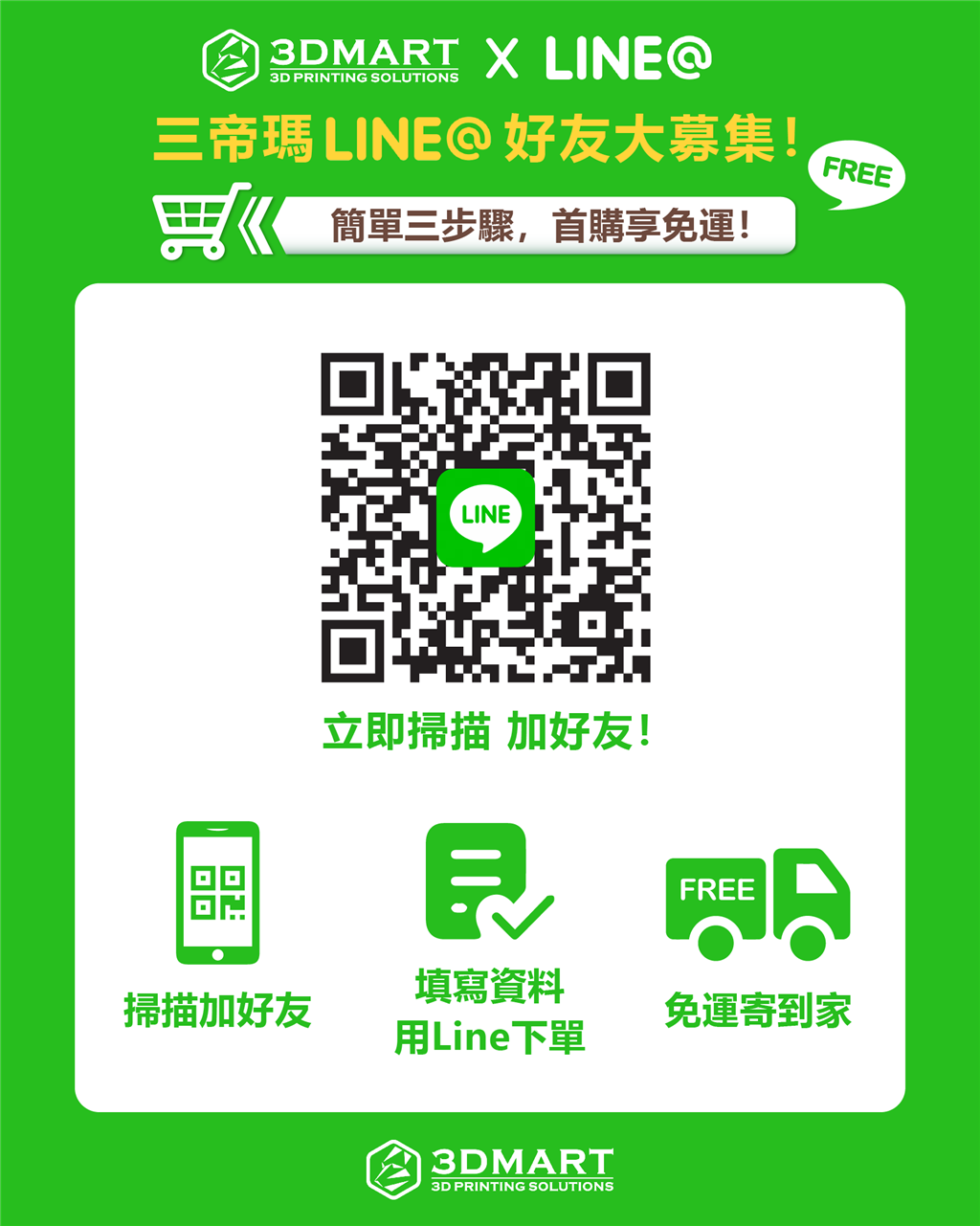 【3D列印優(yōu)惠】官方帳號(hào)上線啦!好友首購享免運(yùn)! 三帝瑪現(xiàn)在也有官方Line帳號(hào),讓商城購物更方便囉!快來加入3D列印生活圈,好友首次購物即享免運(yùn)優(yōu)惠,3D列印線材、樹脂、配件通通有!快來加入Line好友! 好康只要三步驟!活動(dòng)辦法帶你看: 1.掃描QR Code,加入官方Line好友。 2.輸入姓名、e-mail及電話(此為訂單及聯(lián)絡(luò)憑證,敬請(qǐng)確實(shí)填寫),用Line傳送商城購物內(nèi)容。 3.享受免運(yùn)優(yōu)惠,等待商品寄到家! *三帝瑪公司保留所有活動(dòng)最終變更權(quán)利。 *注意事項(xiàng):本活動(dòng)僅適用於商城購物內(nèi)容;不包含代印服務(wù)、掃描服務(wù)及技術(shù)支援,以上服務(wù)仍需進(jìn)入官網(wǎng)系統(tǒng)才可成立訂單。 .代印服務(wù)點(diǎn)我 .掃描服務(wù)點(diǎn)我 .技術(shù)支援點(diǎn)我 追蹤粉絲專頁、抓住3D技術(shù):https://www.facebook.com/m.jcybusiness.com/