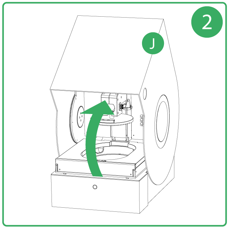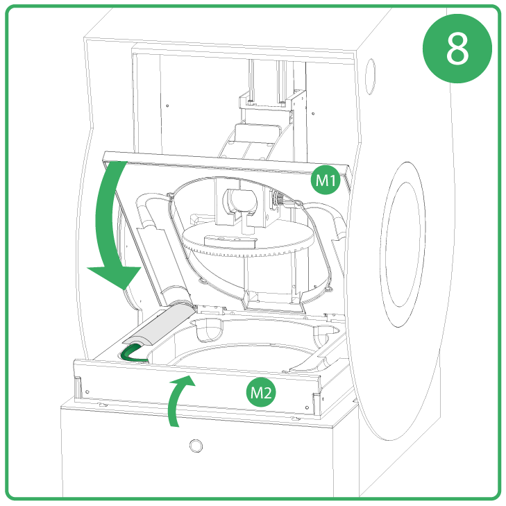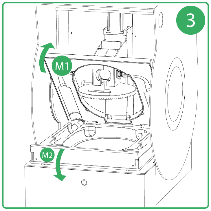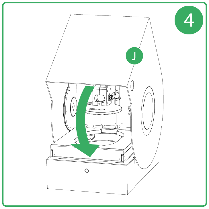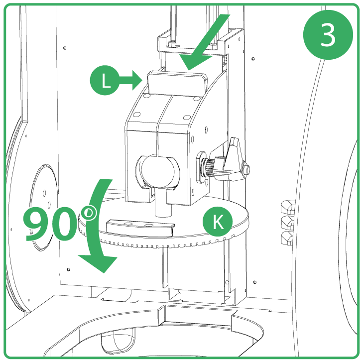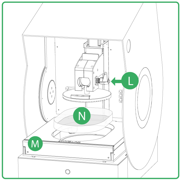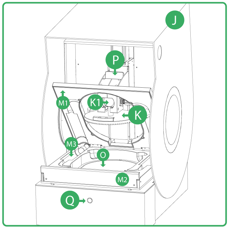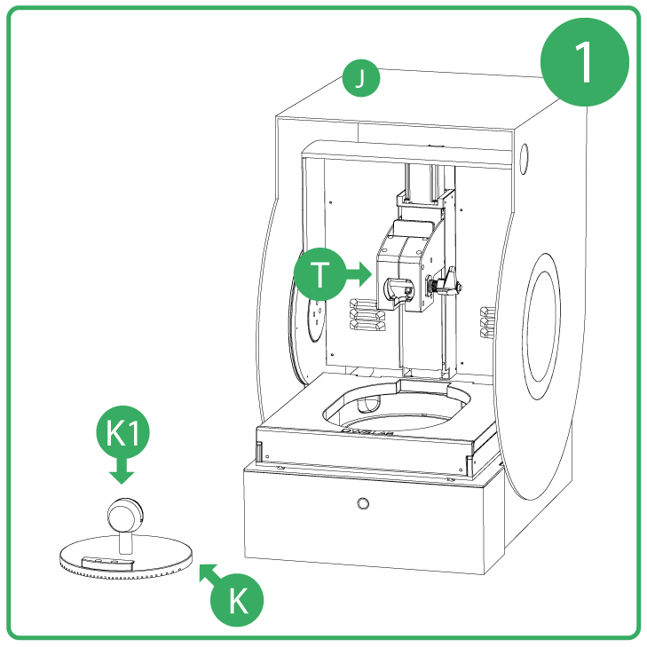 九、列印準(zhǔn)備 ①3D列印機(jī)啟動(dòng) 1. 打開列印機(jī),啟動(dòng)Fictor並按開門鍵(“Open”)。 2. 提起列印機(jī)遮罩(J)。 3. 將固定樹脂匣(M1)上蓋的樹脂盒卡扣(M2)往使用者的方向拉起。 4. 將樹脂槽放入列印機(jī)內(nèi)(N),確保凹槽與樹脂匣(M3)的外殼吻合。 5. 搖晃樹脂並取下樹脂頂部的綠色蓋子(R)(不要取下保護(hù)膜)。 6. 將噴嘴(S)按壓到位,直到完全插入,然後如圖所示旋轉(zhuǎn)噴嘴。 7. 按照標(biāo)籤上的說明(要列印在樹脂標(biāo)籤上的指示後要檢查的項(xiàng)目6和7)將樹脂插入樹脂匣(M3)中。 8. 按下樹脂匣上蓋(M1)將其關(guān)閉。檢查樹脂盒卡扣(M2)確認(rèn)上蓋已被鎖定。 ②平臺(tái)定位(移除階段) 1. 檢查平臺(tái)是否乾淨(jìng),並使用專門提供的梳子和用酒精(乙醇)沾濕的無絨布清除乾燥的樹脂殘留物。 2. 將平臺(tái)旋鈕(K1)插入相應(yīng)的孔洞(T),使U處於水平位置,然後按直到完全插入。 3. 向用戶方向拉動(dòng)鎖定桿(L),使平臺(tái)移動(dòng)旋轉(zhuǎn)到水平位置上(K)。 注意:在這個(gè)階段不要鎖定平臺(tái)。 4. 放下列印機(jī)遮罩(J)。