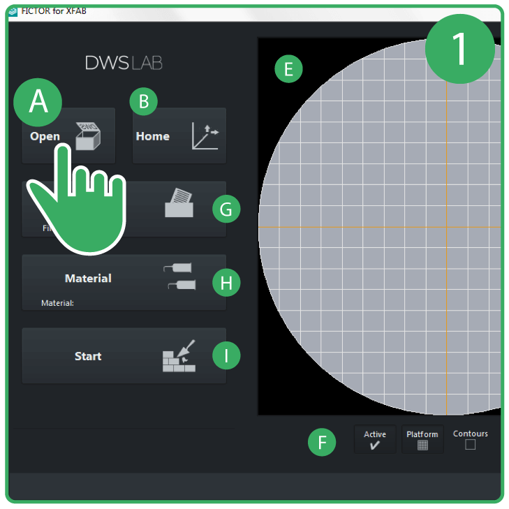 五、列印機(jī)管理 要下載列印機(jī)軟體,請(qǐng)按以下步驟操作: 1.前往customers.dwssystems.com頁面 2.如有必要,請(qǐng)點(diǎn)擊“Sign in”並輸入用戶名和密碼進(jìn)行登錄。 3.點(diǎn)擊“Software”。 4.下載“Fictor”軟體(PC最低要求:Windows7 SP1或更高版本,OpenGL顯示卡,雙核處理器,USB連接端)。 5.下載“Nauta”軟體(*)(32位元或64位元,取決於操作系統(tǒng))。 6.前往您的下載文件夾,點(diǎn)擊剛下載的安裝程式來進(jìn)行安裝下載程序。 7.要索取安裝所需的代碼,請(qǐng)點(diǎn)擊“Licences”。 (*)查看“Nauta”軟體手冊(cè),前往協(xié)助選單(View Help),在程式裡面。 初始化“Fictor”程式時(shí)(警告:初始化時(shí)程式可能請(qǐng)求管理員權(quán)限,Windows提示時(shí)回答YES),主螢?zāi)粚⒋蜷_,並顯示以下: A. 打開外殼鑰匙。 B. 列印機(jī)初始化鍵。 C. 列印機(jī)狀態(tài)指示燈。 D. 列印狀態(tài)指示器。 E. 建模平臺(tái)顯示。 F. 顯示用戶設(shè)定控制區(qū)(參考E)。 G. 3D列印文件選擇鍵。 H. 列印材料選擇鍵。 I. 列印開始鍵。