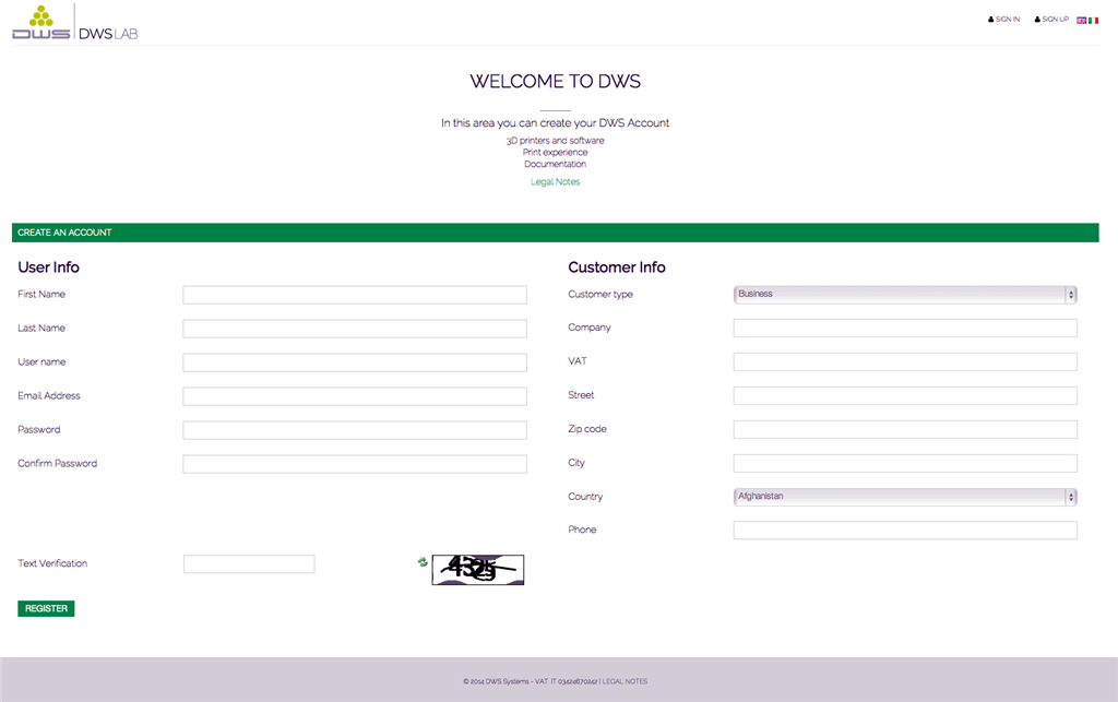 三、用戶註冊(cè) 1.前往customers.dwssystems.com頁面 2.點(diǎn)擊“Sign in”前往註冊(cè)頁面。 3.輸入所需的訊息,然後按照說明完成註冊(cè)。 4.打開註冊(cè)驗(yàn)證郵件,然後點(diǎn)擊驗(yàn)證連結(jié)。 5.點(diǎn)擊“Vertify”以完成註冊(cè)。 6.點(diǎn)擊“Sign in”。 7.輸入用戶名和密碼,然後點(diǎn)擊“Login”。 8.點(diǎn)擊“Register 3D printer”以註冊(cè)您的3D列印機(jī)。 9.在相對(duì)應(yīng)的框框中輸入序列號(hào)(位於列印機(jī)背面的名牌上)和列印機(jī)型號(hào),然後點(diǎn)擊“Save”。 10.如果打開列印機(jī),則可以通過點(diǎn)擊“Save”將列印機(jī)與註冊(cè)用戶斷開。
