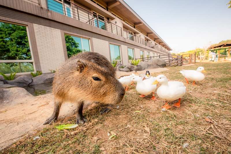 「六福村」是每個臺灣人從小到大的玩伴,樂園旁的「關西六福莊生態(tài)度假旅館」更是亞洲第一座以自然生態(tài)、草食性動物為景觀設計的生態(tài)渡假飯店!走入飯店內,將看到全臺獨有的TingaTinga非洲風格後現(xiàn)代壁畫,為六福莊斥資百萬邀請TingaTinga藝術畫派的北非畫家,以旅館做畫布,以畫筆在六福莊的每個角落說故事,帶著孩子一同感受非洲動物大遷徙的壯觀景象。在房間享受非洲生態(tài)之餘,還能和動物大明星長頸鹿、白犀牛、環(huán)尾狐猴、狐獴、羊駝,及新人氣王水豚、侏儒山羊…等高達23種動物近距離同樂!