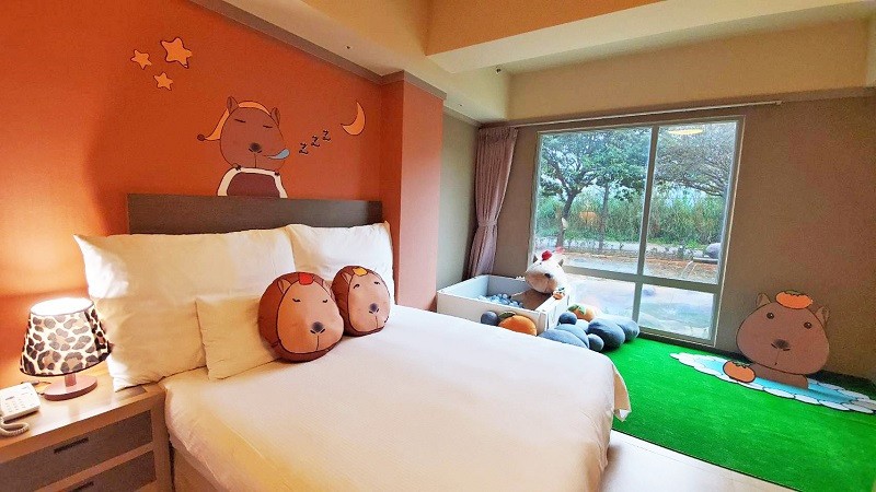 為了讓旅客認識多物種共棲的特色,「福豚主題房」還能全天候欣賞「水豚」瞇眼曬太陽、放鬆泡湯的景緻,是全臺獨有的超萌奇景!