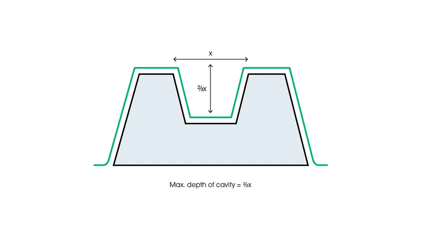 如果你的模板具有凹陷,那麼請(qǐng)確保凹陷的深度不超過(guò)其表面開(kāi)口寬度的三分之二。如果更大最終部分表面變薄的風(fēng)險(xiǎn)大大增加。