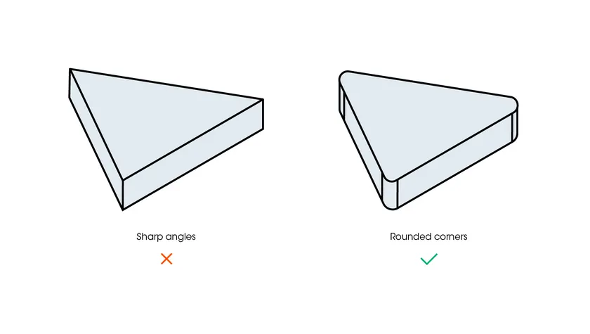 熱成型並不適用於具有銳利角(小於90°)的模板。除了最小的傾斜角度,銳利的垂直角更容易導(dǎo)致塑膠片在成型過(guò)程中出現(xiàn)網(wǎng)狀撕裂。為了避免這種情況並提高部分質(zhì)量,請(qǐng)確保模板的所有角落和邊緣都是圓的。