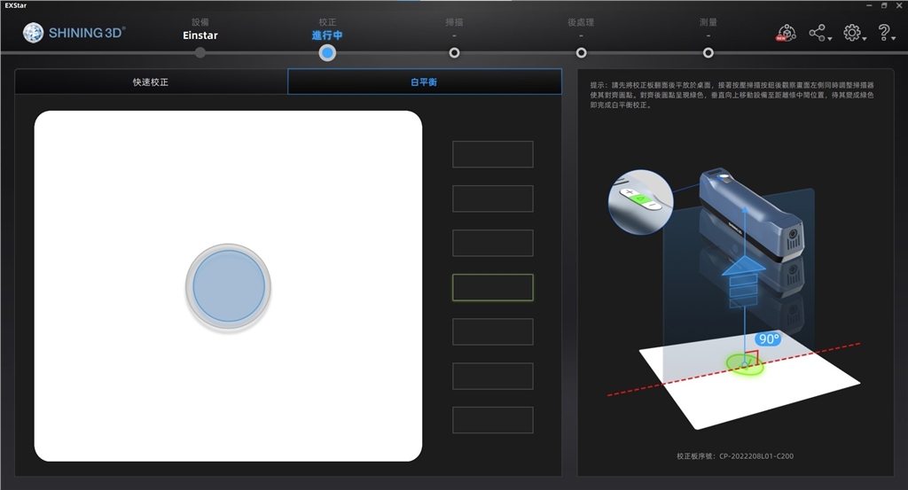Shining 3D EinStar附有專用「校正板」,在開始3D掃描之前,只需依照軟體指示,對準(zhǔn)掃描方框進(jìn)行校正,即可輕鬆完成系統(tǒng)校正。分成兩個步驟,快速校正;總共需要從5個不同的角度(上、斜前、斜後、斜左、斜右)進(jìn)行擷取。白平衡;緩慢平穩(wěn)的上下移動掃描設(shè)備,在軟體提示中合適的高度時,掃描設(shè)備會自動擷取並完成白平衡校正。
