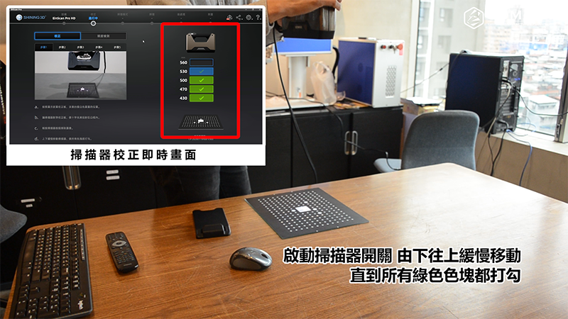 依照SHINING 3D掃描軟體的步驟,對準(zhǔn)校正板進(jìn)行校正,啟動掃描器開關(guān),由下往上緩慢移動,直到所有綠色色塊都打勾;使用專用支架將校正板墊高,依照軟體中指示,接續(xù)進(jìn)行校正。