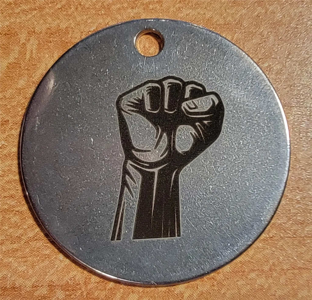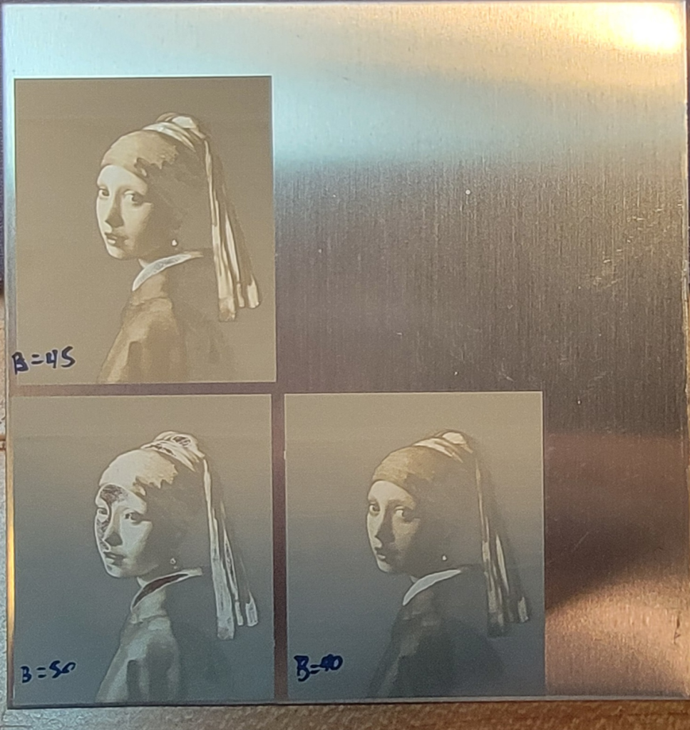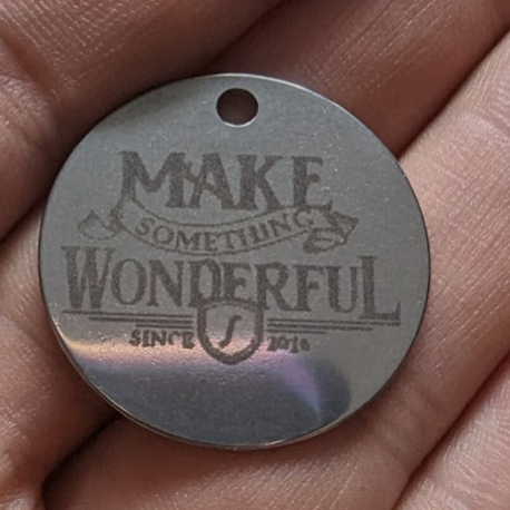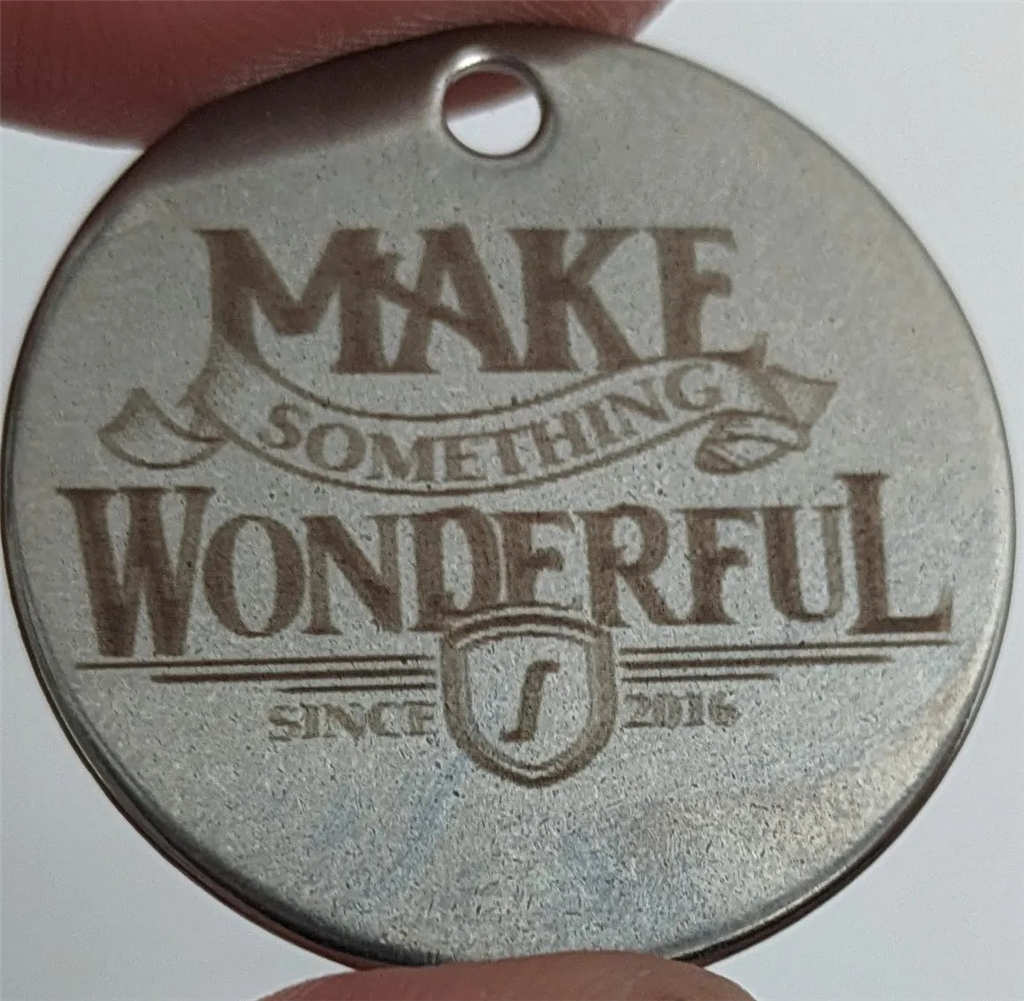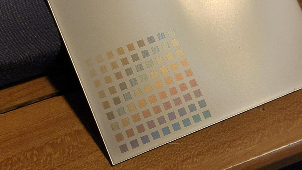嘗試用2W 紅外雷射在不鏽鋼、鈦、鉭和鈮板上生成雷射顏色。上圖是獲得的最好結(jié)果。它在不鏽鋼304上。顏色非常依賴觀看角度,從正面看主要呈現(xiàn)棕色。通常40W 雷射在同樣的鋼材上能產(chǎn)生更好的顏色,部分原因是因為紅外雷射的光斑比40W 小。顏色實驗表明,光束重疊的程度對生成的顏色有很大影響,因為金屬氧化物光學(xué)干涉層的厚度很大程度上取決於任何給定區(qū)域看到的雷射能量總和。更緊密的光斑需要更密集的線間隔才能獲得顯著的光束重疊,30微米的紅外光斑需要約30微米或更小的線間隔。這接近雷射龍門可以移動的最小間隔,因此在嘗試不同顏色時沒有太多操作空間。此外,這些小間隔導(dǎo)致填充區(qū)域的時間比40W 雷射長得多。結(jié)論是,2W 紅外雷射模組在不鏽鋼上不適合進行全彩雷射標(biāo)記。