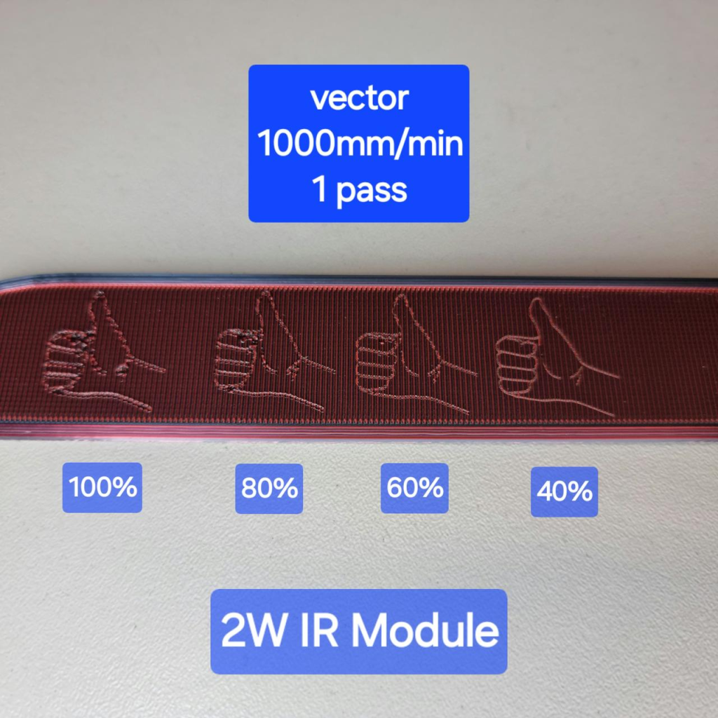 2W 紅外雷射模組在各種金屬和塑料材料上產(chǎn)生更高的細(xì)節(jié),導(dǎo)致更清晰和更明顯的雕刻效果。與藍光雷射相比,2W 紅外雷射在5052鋁、PCB、PLA、白色和黑色丙烯酸、陽極氧化鋁和矽膠等材料上取得了更好的雕刻效果。