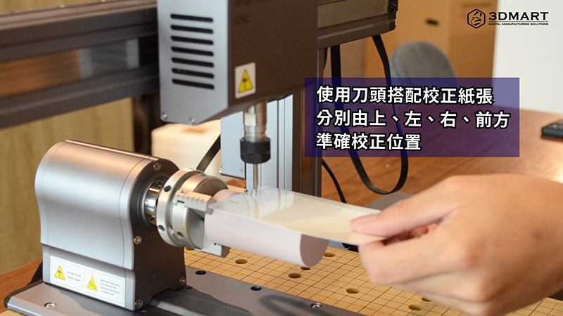 校正主要是透過刀頭、校正紙張(內(nèi)附),分別由材料上、左、右、前四個方向,進行準確位置校正,點選螢?zāi)簧系募^按鈕,即可即時控制刀頭方向;完成校正後,安裝旋轉(zhuǎn)軸尾座,設(shè)備前置作業(yè)就完成了!