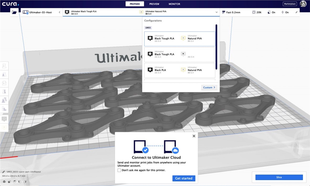 通過(guò)網(wǎng)路線或雲(yún)端連接的Ultimaker 3或Ultimaker S5列印機(jī)可以自動(dòng)同步材料和列印設(shè)定,如果有多臺(tái)Ultimaker列印機(jī)相互串聯(lián),選擇最適合您需求的材料即可,無(wú)須對(duì)單一列印機(jī)、單一材料進(jìn)行大量重設(shè)。