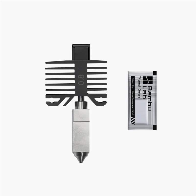 帶不鏽鋼噴嘴的熱端組件採(cǎi)用的一體成形設(shè)計(jì)。僅適用於Bambu Lab 3D列印機(jī)。噴嘴集成到模組中,並透過(guò)細(xì)金屬連接到散熱器,已獲得最佳性能。有了這種設(shè)計(jì),模組的加熱速度會(huì)比普通的模組快得多,而且一體成形設(shè)計(jì)有效地減少更換噴嘴可能的問(wèn)題。散熱片採(cǎi)用高導(dǎo)熱鋁合金,喉部採(cǎi)用TC4鈦合金。噴嘴由銅合金和不鏽鋼組合製成,在保證硬度的同時(shí)可大流量列印。