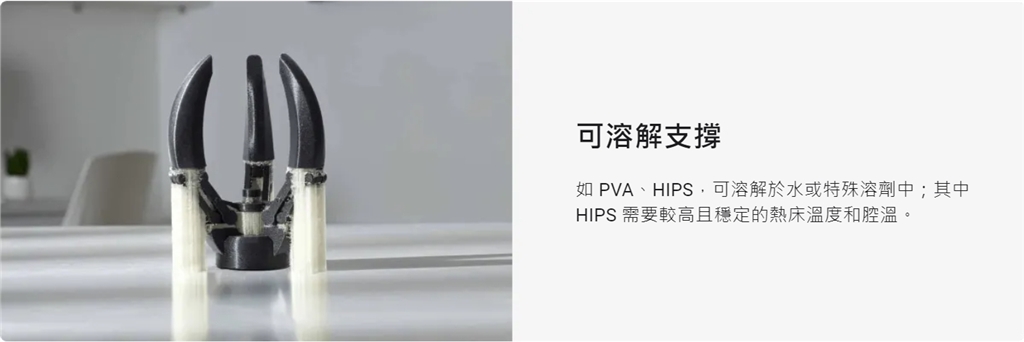 Artisan雙噴頭列印模組可列印 PVA、HIPS 等可溶解耗材,無懼複雜幾何結構,成品支撐結構面平整美觀。