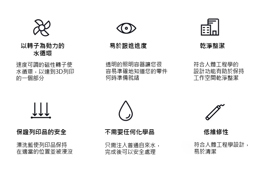 沖洗籃讓列印成品安全地放入水中,然後提起沖洗籃,水自然排出,可以輕鬆取出列印成品。