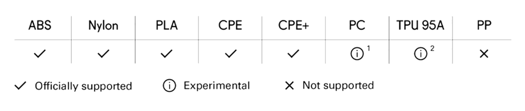 (*)表示這些組合僅在安裝加熱床升級(jí)時(shí)以實(shí)驗(yàn)性方式使用。
