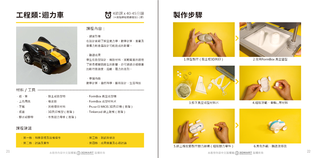 使用黏土或3D列印製作原型後,使用FormBox真空塑型,剪下真空成型材料片再進(jìn)行組裝,綁上橡皮筋以製作迴力結(jié)構(gòu),最後再依照需求美化外觀;過程中可以了解空氣力學(xué)、重量及摩擦力,設(shè)計屬於自己的車隊!