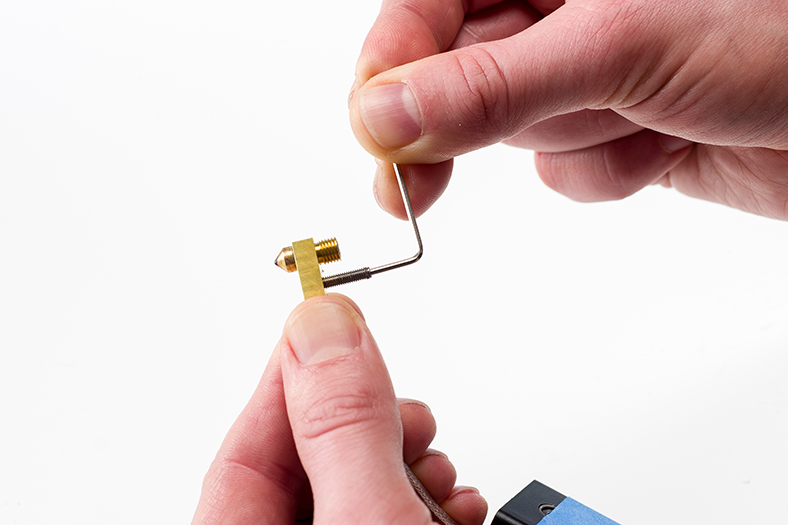 - 使用六角扳手插入加熱端隔離器的孔中,逆時(shí)針旋轉(zhuǎn)將噴頭從熱端隔離器(如下圖所示的金屬部件)鬆開。通過(guò)這種方式,將噴嘴取下。